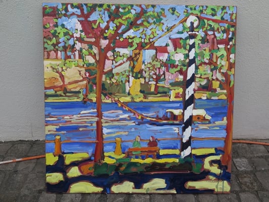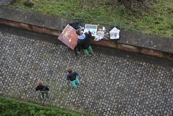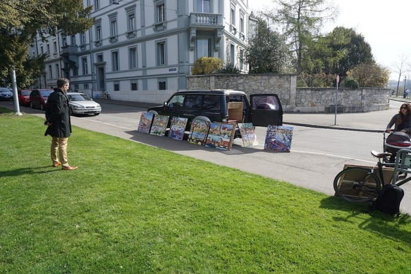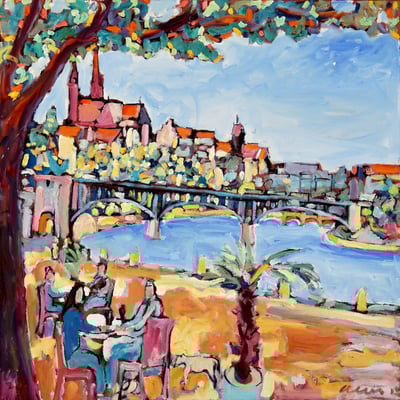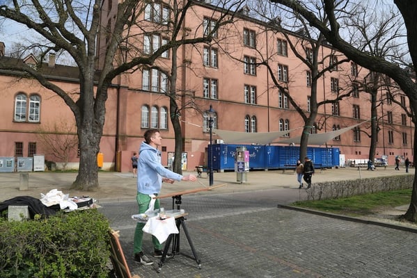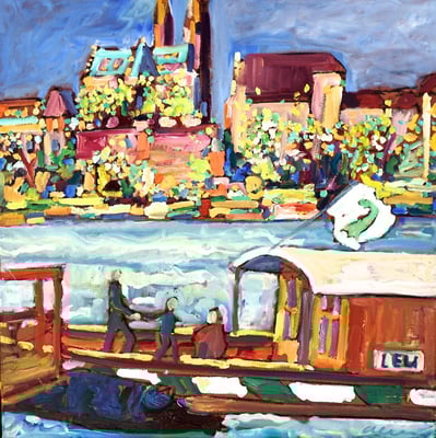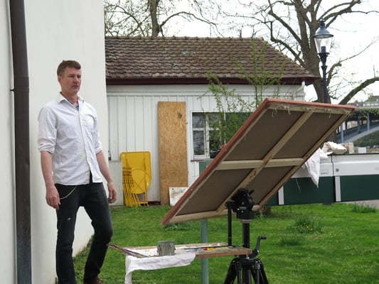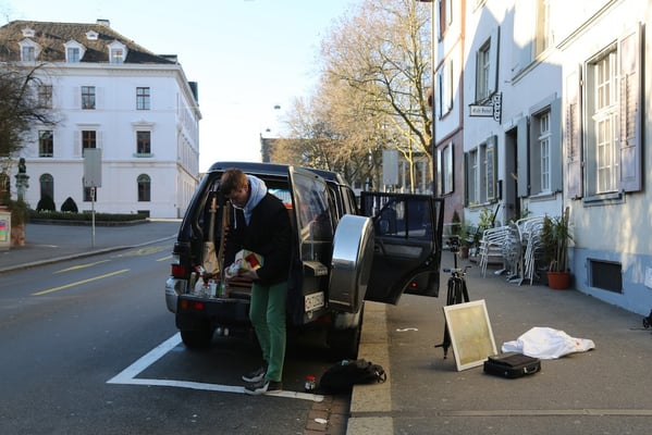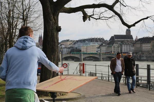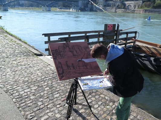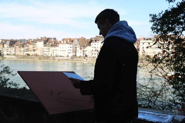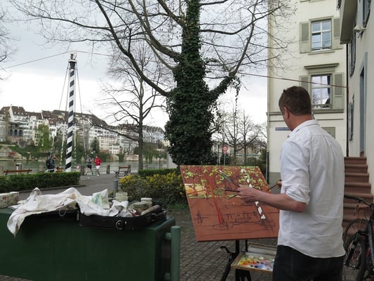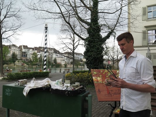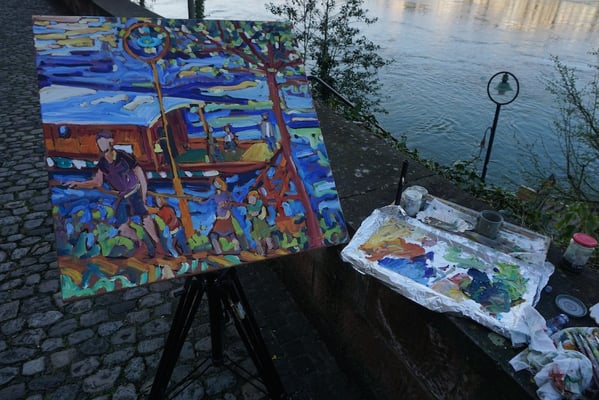 Während des Aufenthalts am Basler Rheinhafen entstand die Werkgruppe „Münster Fääri Leu“- Die Basler und ihr Rhein. Für diese Werkgruppe arbeitete ich als als Urban Sketcher, der direkt vor Ort malt. Dies braucht eine akribische Vorbereitung. Die Leinwände müssen im Vorhinein aufgezogen, grundiert und dann an den Malort transportiert werden. Für das Malen im urbanen Raum habe ich mir extra eine eigene Staffelei konstruiert, um nach dem Prinzip „Mise en Place" arbeiten zu können. Dies ist sehr entscheidend, da ich beim Urban Sketching mit der Staffelei immer wieder den Platz wechsle, um ein neues Motiv festzuhalten, oder dem Wind und Regen zu entfliehen. Die Bilder zeigen das bunte Treiben am Rheinufer und lassen uns einen Moment verweilen in einer Zeit in der alles fliesst und nichts bleibt.
