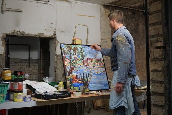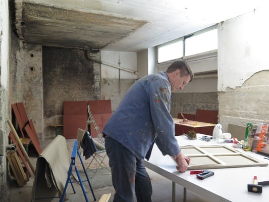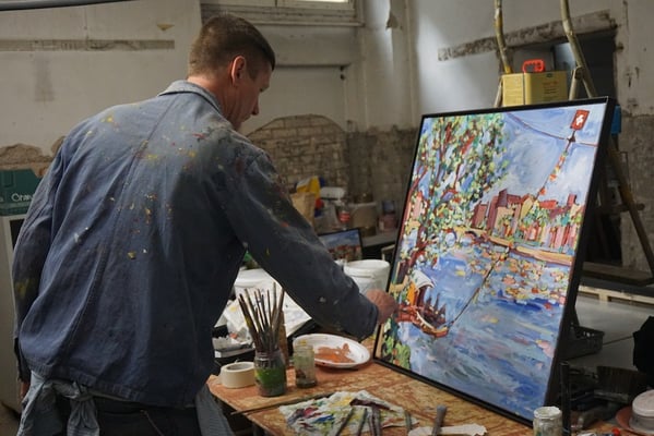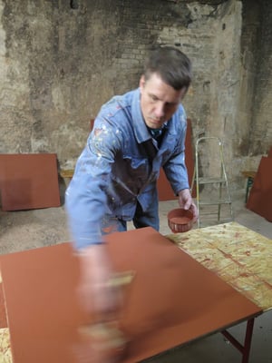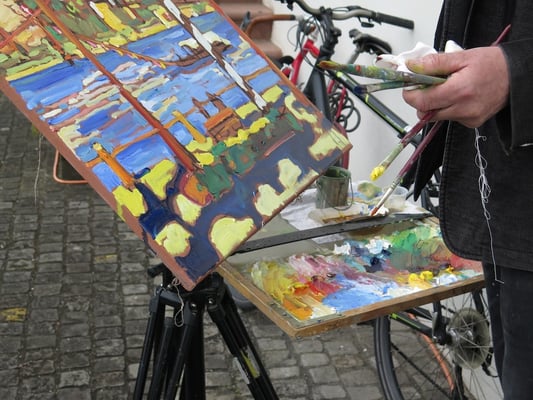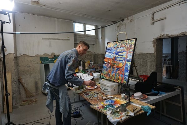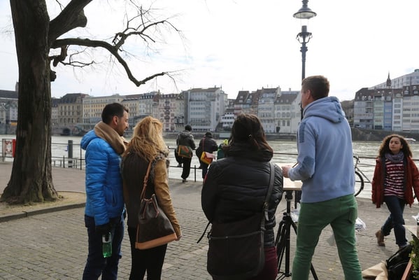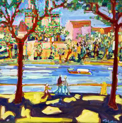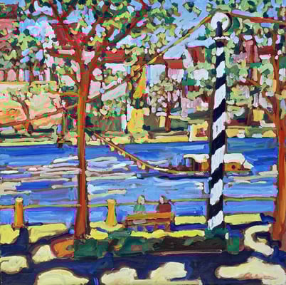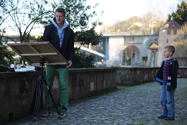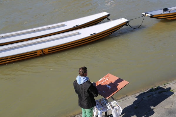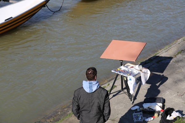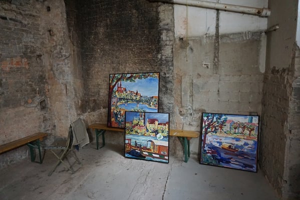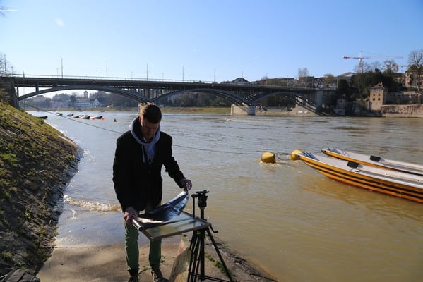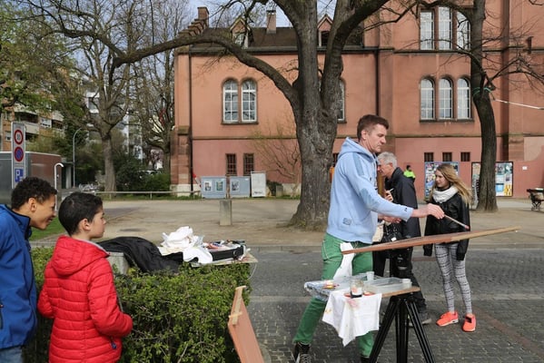 Während des Aufenthalts am Basler Rheinhafen entstand die Werkgruppe „Münster Fääri Leu“- Die Basler und ihr Rhein. Für diese Werkgruppe arbeitete ich als als Urban Sketcher, der direkt vor Ort malt. Dies braucht eine akribische Vorbereitung. Die Leinwände müssen im Vorhinein aufgezogen, grundiert und dann an den Malort transportiert werden. Für das Malen im urbanen Raum habe ich mir extra eine eigene Staffelei konstruiert, um nach dem Prinzip „Mise en Place" arbeiten zu können. Dies ist sehr entscheidend, da ich beim Urban Sketching mit der Staffelei immer wieder den Platz wechsle, um ein neues Motiv festzuhalten, oder dem Wind und Regen zu entfliehen. Die Bilder zeigen das bunte Treiben am Rheinufer und lassen uns einen Moment verweilen in einer Zeit in der alles fliesst und nichts bleibt.