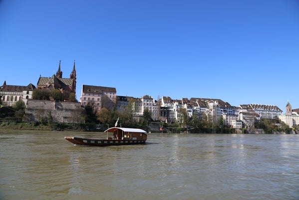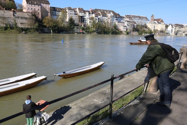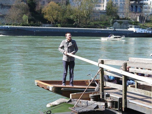 Seine Holzfähre hat keinen Monitor, sie ist noch aus einer früheren Zeit und wird bloss verbunden mit einem Seil, das den Rhein in grosser Höhe überquert, durch die Kraft der Strömung vom einen zum anderen Ufer getragen. So transportiert die Fähre täglich duzende Passagiere von Grossbasel nach Kleinbasel und wieder zurück. Bis 1879 waren die beiden Stadtteile nur durch die Mittlere Rheinbrücke miteinander verbunden, daher war die Rheinfähre nach ihrer Einführung ein beliebtes Transportmittel.